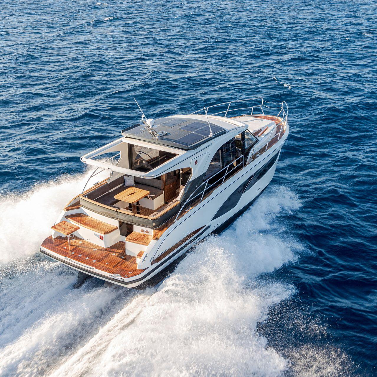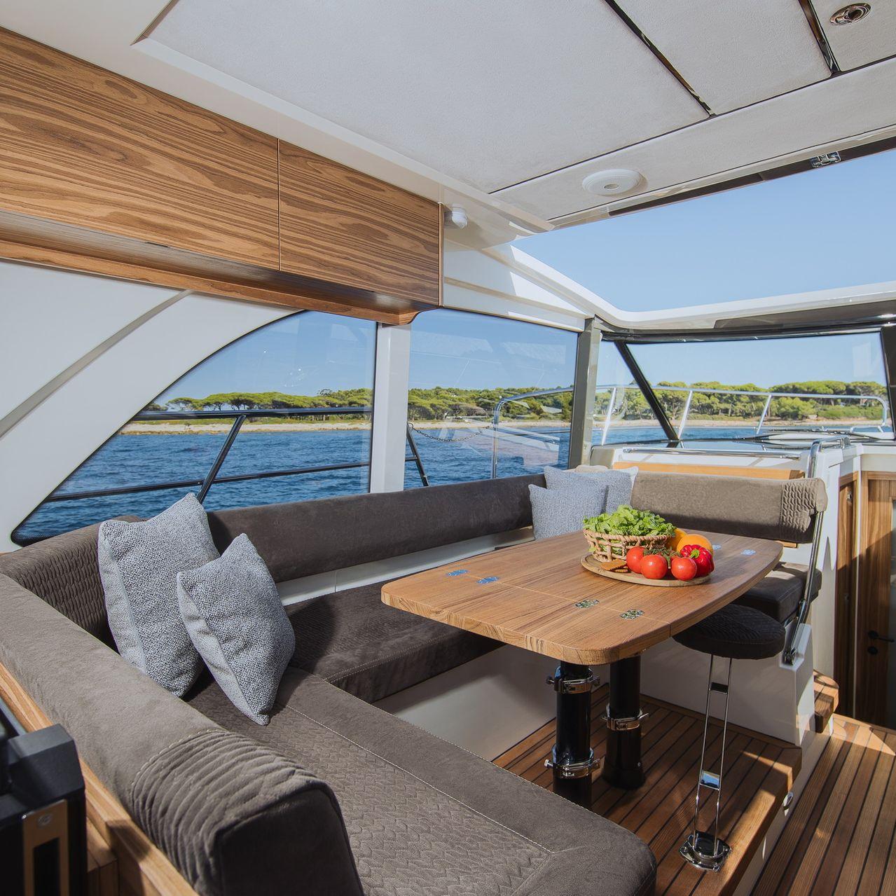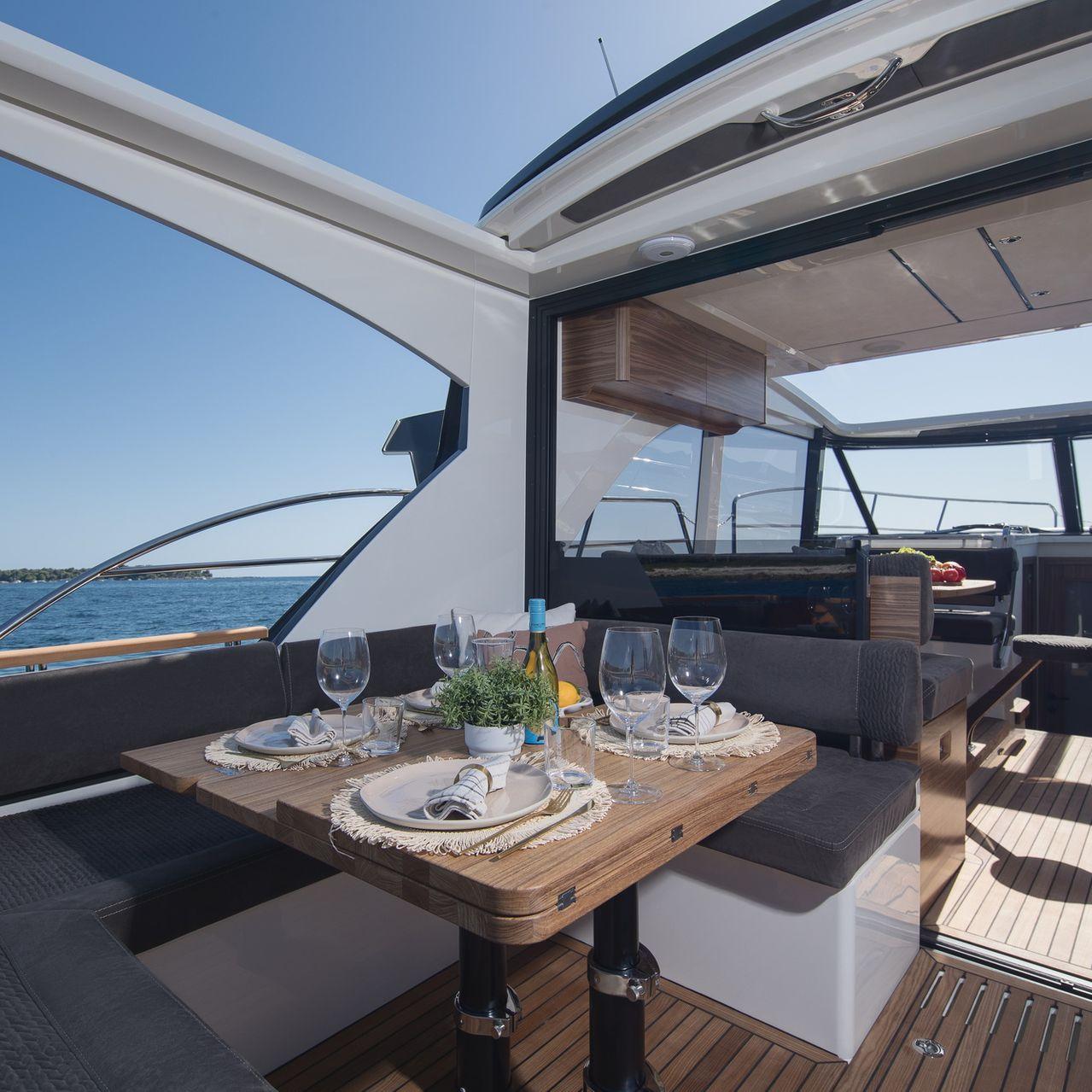 U-shaped cockpit sofa for eight with extendable seating, transparent transom gate, walk-around decks and foredeck sunpad offer generous entertainment areas