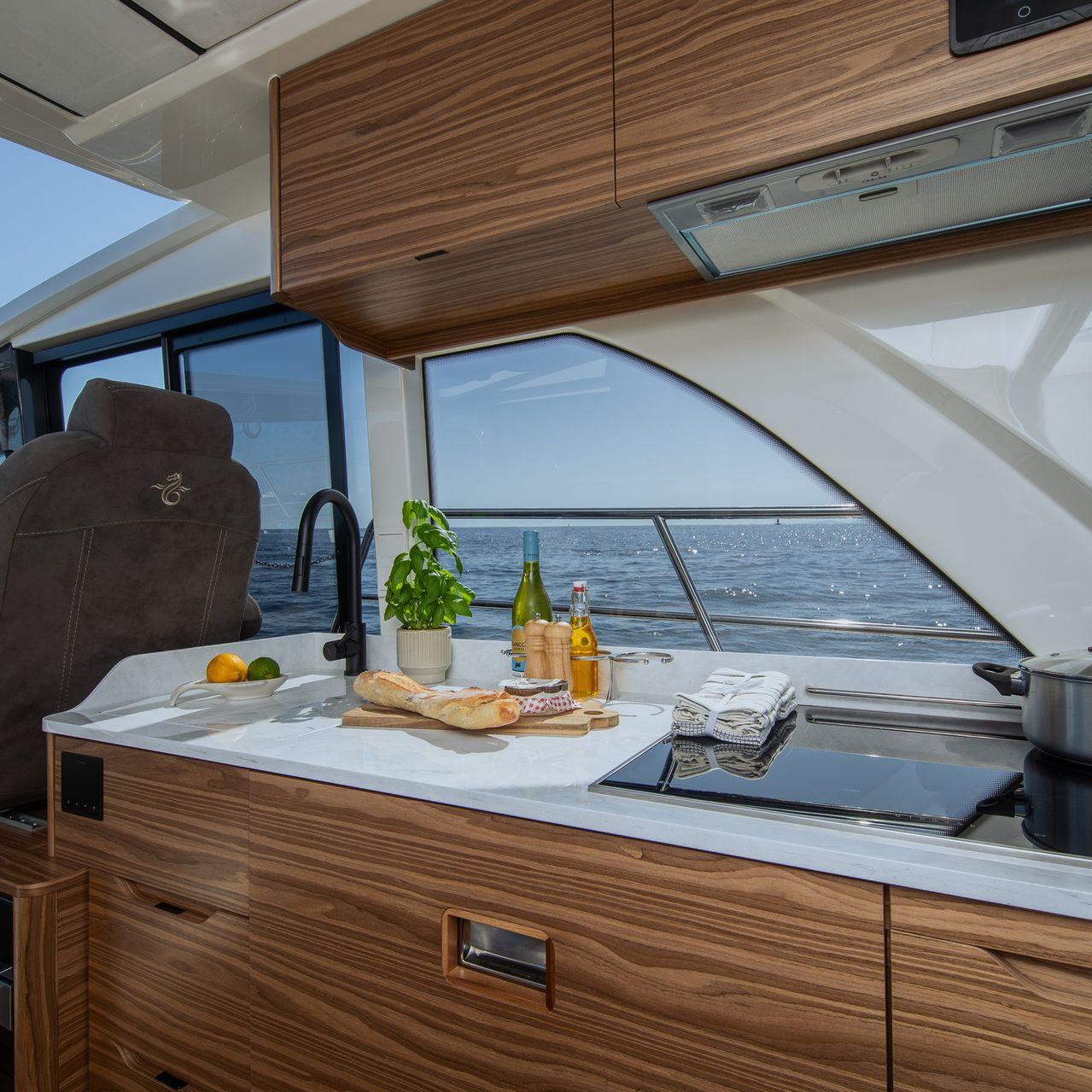 On-deck galley featuring induction or gas hob, sink, double fridge/freezer, optional oven and ample cabinetry supports extended passage making